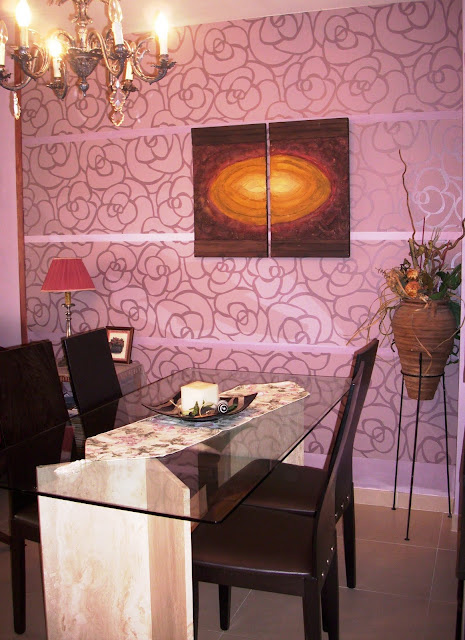En el comedor una combinación un poco atípica de papel y pintura. La particularidad es que el papel esta colocado en horizontal en vez de arriba a abajo, como es habitual. Queda realmente original. Una manera de aprovecharlo al máximo. . Es arrancable y pude reutilizarlo en otro espacio en la nueva decoración del piso. La mesa es un sobre de cristal con las patas de mármol travertino